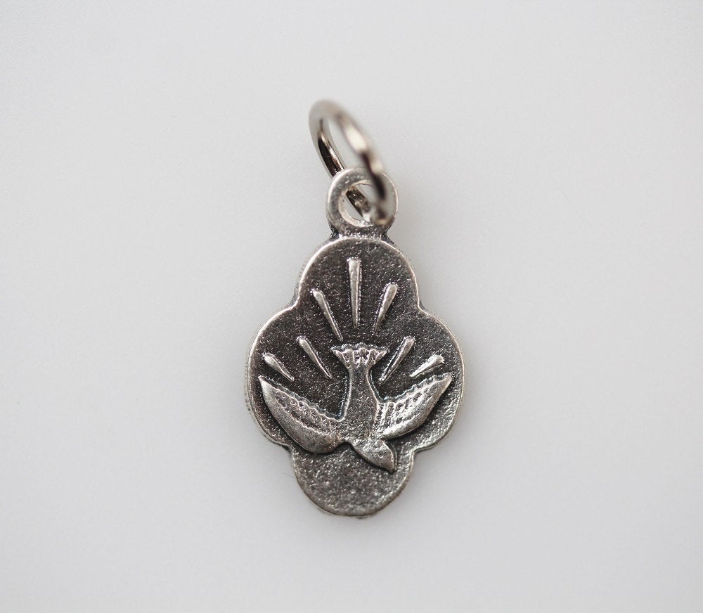 SKU: CM181Silver-tone holy spirit dove charm with nice detail. The backside is flat. There is a jump ring attached to the bail. This detailed die-cast medal is made in the region of Italy that produces the finest quality medals in the world.