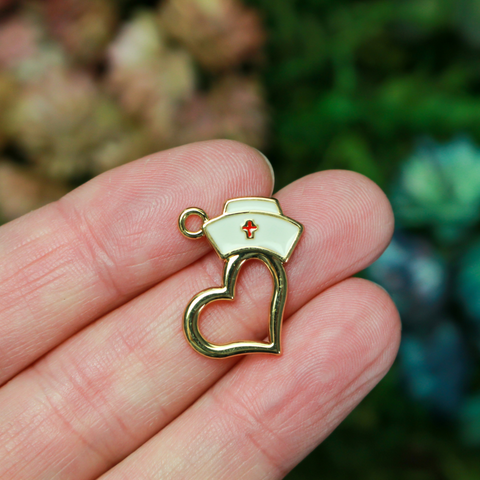 Nurse Cap Heart Charms Gold Plated White Enamel with Red Cross Design 5pcs