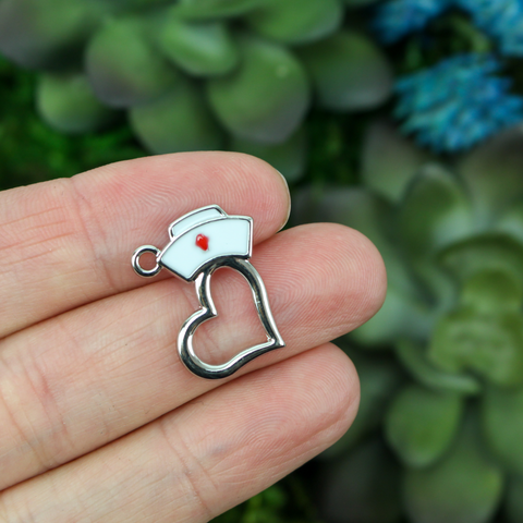 Nurse Cap Heart Charms - White Enamel with Red Cross Design 5pcs