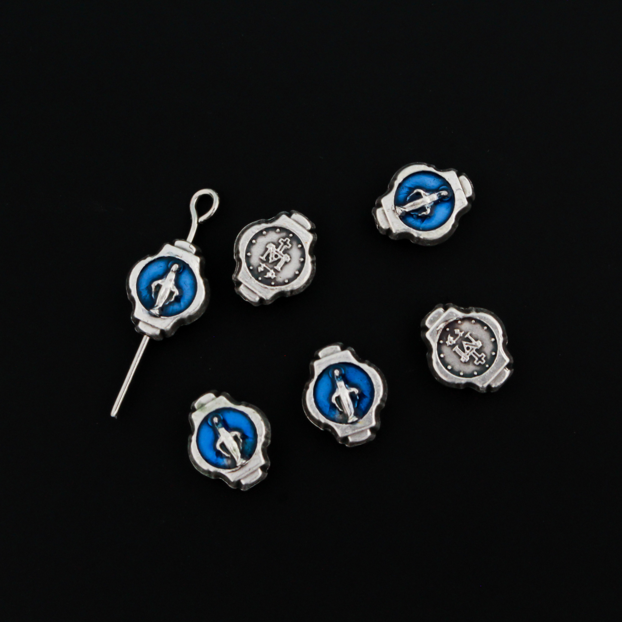 Blue Miraculous Medal Spacer Beads, Silver Plate Our Father Beads - 6pcs