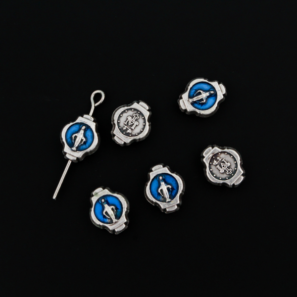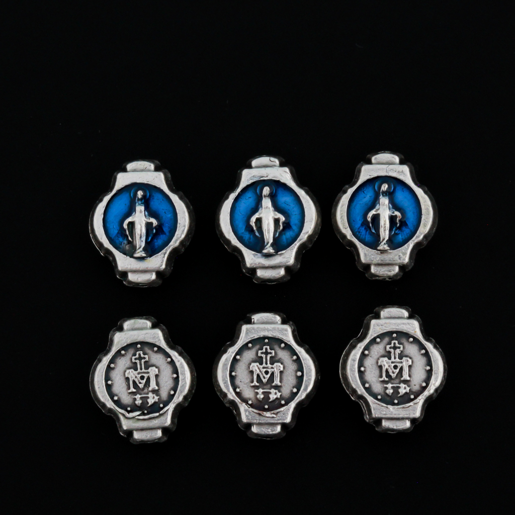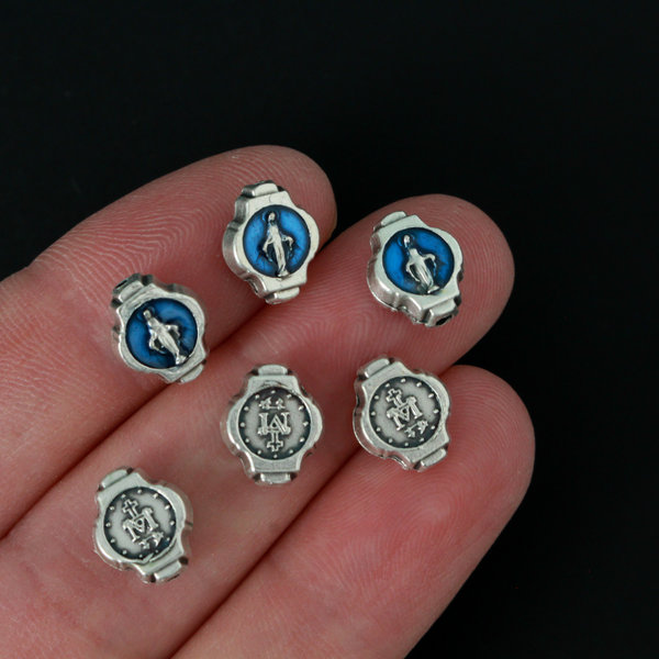 SKU: PA17Miraculous Medal oval beads that are silver oxidized base metal made in Italy. The front side of the bead has blue enamel detail, the backside does not (see photos). They are perfect to use as accent beads, Our Father beads, or they can be used for a whole rosary or bracelet! Sold in sets of six.