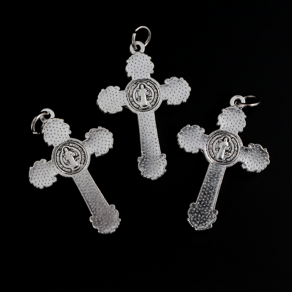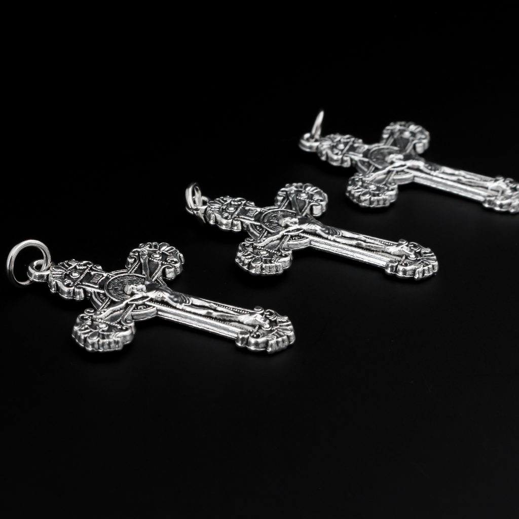 SKU: CH226Three ornate crucifix crosses in an antiqued silver-tone color with the medal of Saint Benedict behind Jesus. The St Benedict medal serves as protection against evil and temptation, secures a timely and healthy birth for children as well as protection against body afflictions and contagious diseases.