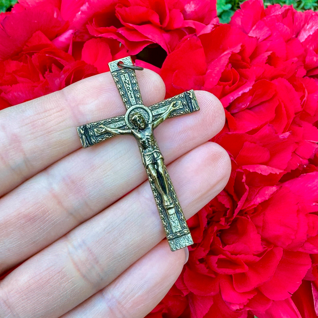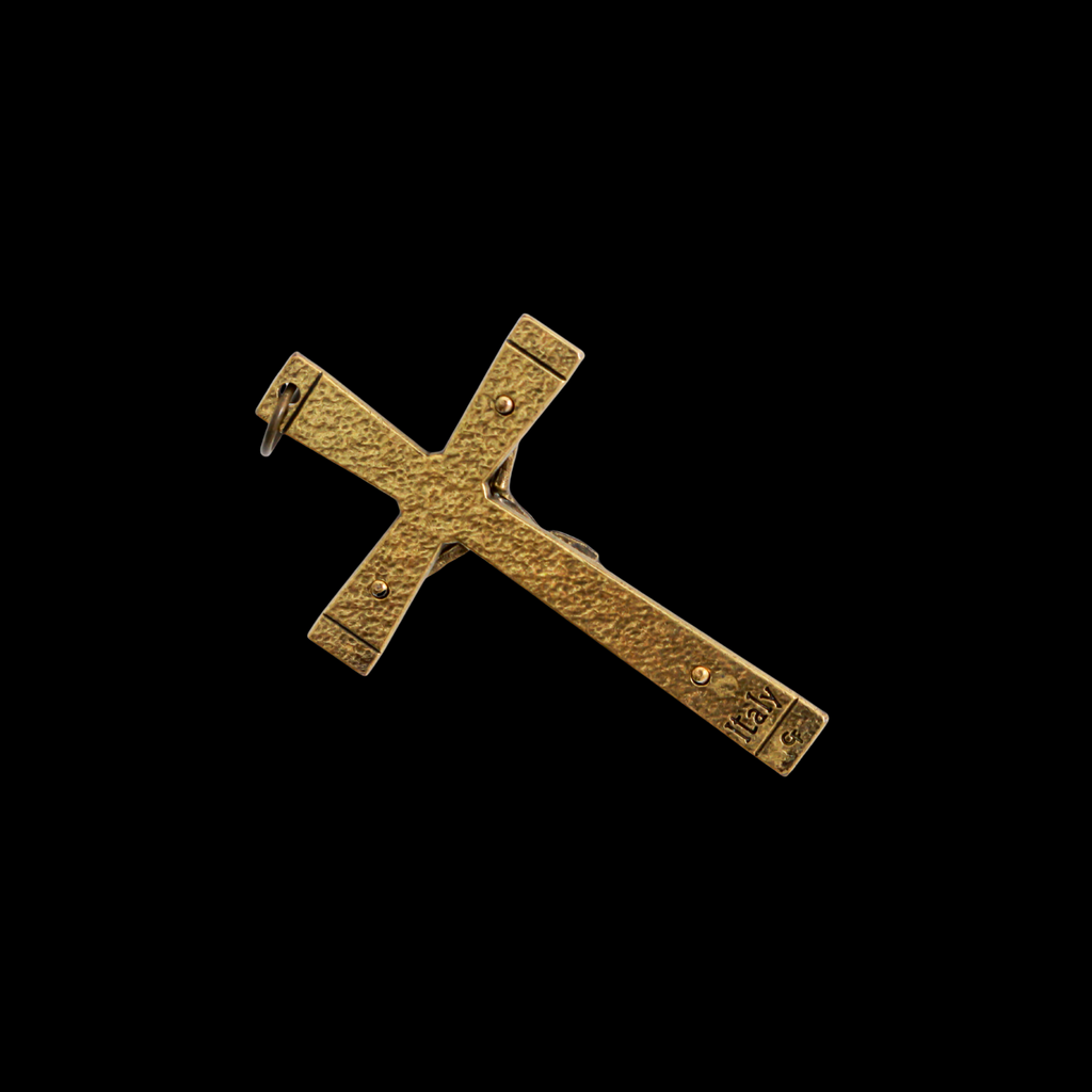 Simple traditional cross that has a textured design and an angel on each end of the cross beam facing Jesus. It would be a great addition to a medium or large size rosary or chaplet. This detailed die-cast cross is made in the region of Italy that produces the finest quality medals in the world. Antiqued bronze finish.