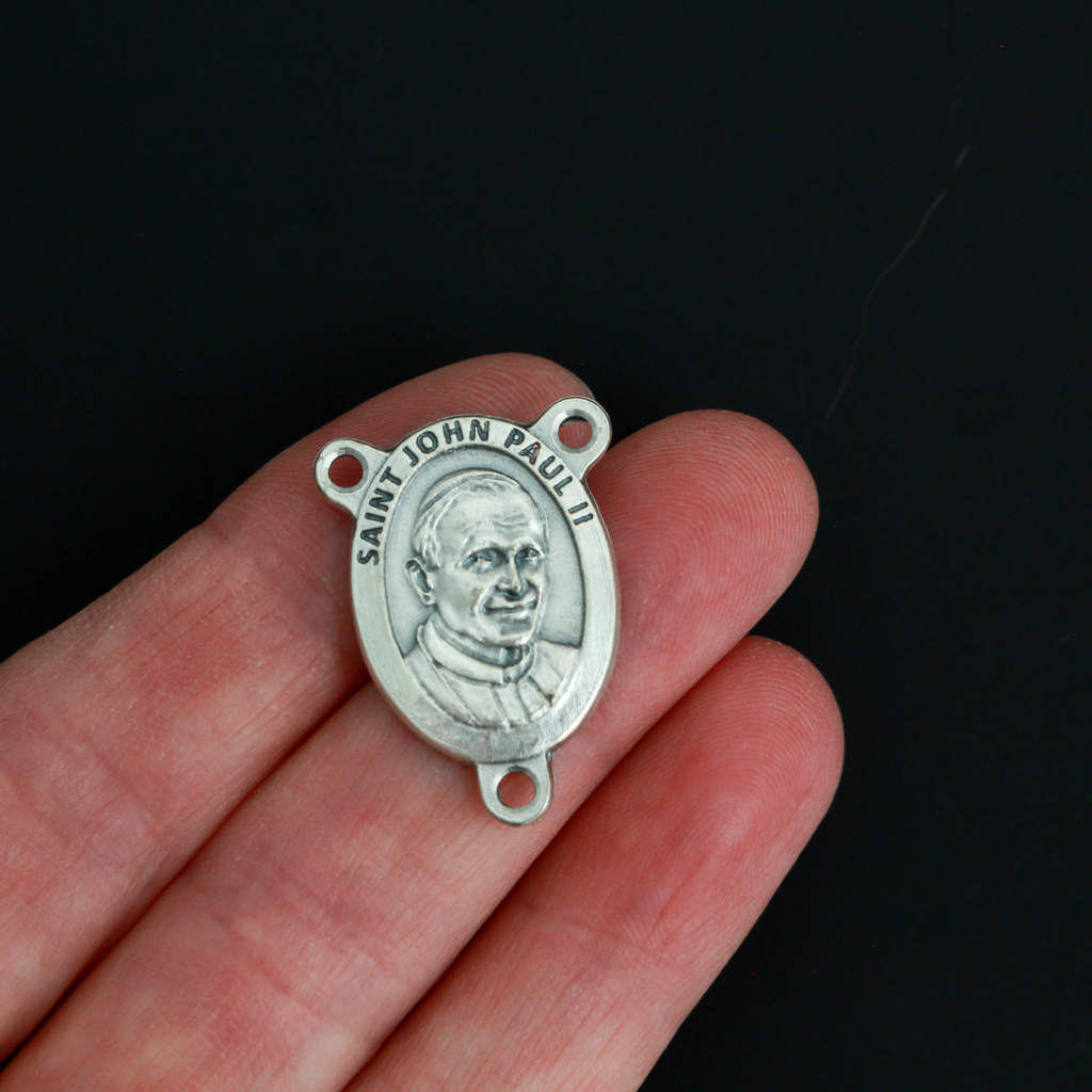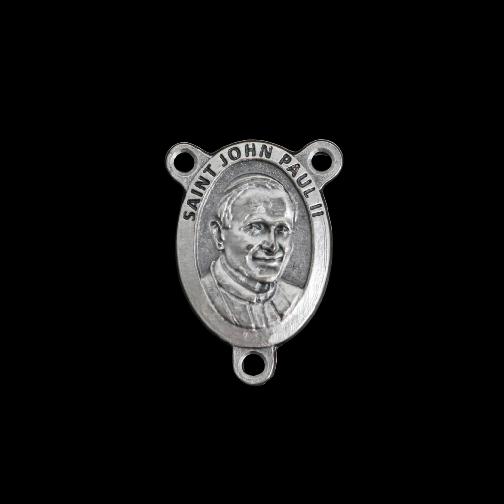 St. John Paul II oval rosary centerpiece that depicts the saint on the front and has a textured pattern on the backside. This detailed die-cast centerpiece is made in the region of Italy that produces the finest quality medals in the world.