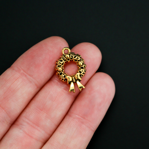 Christmas Wreath Charm - Antiqued Golden, 19mm long - 25pcs