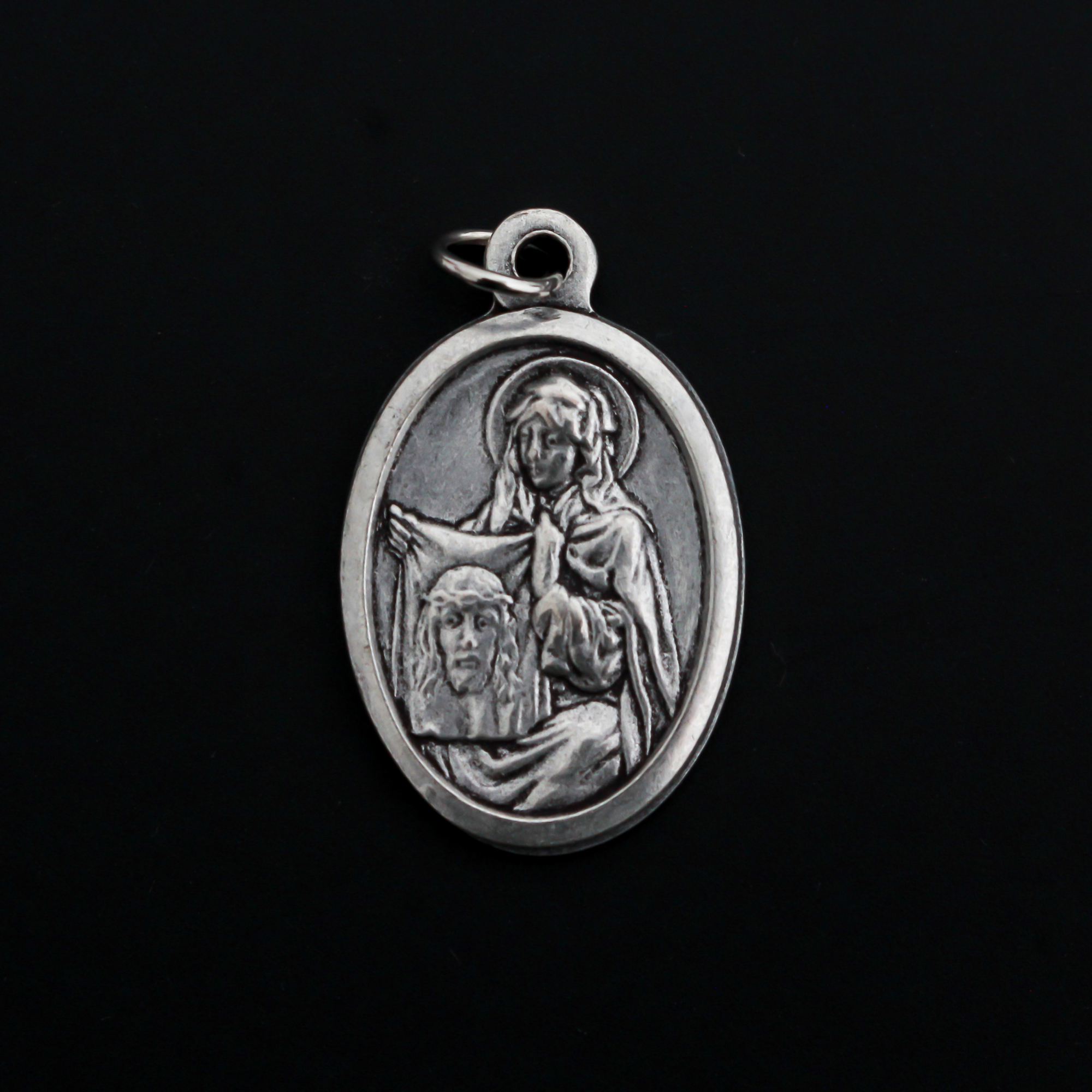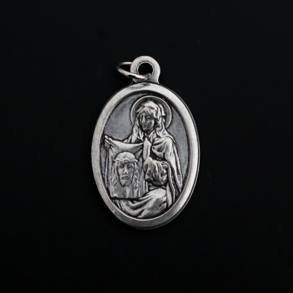 Saint Veronica oval religious medal. The front of the medal depicts St. Veronica holding the Veil of Veronica and the reverse is marked "Pray For Us". This detailed die-cast medal is made in the region of Italy that produces the finest quality medals in the world.