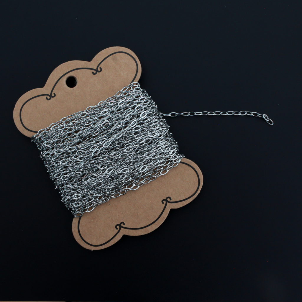 SKU: JS57Tarnish resistant 304 stainless steel cable chain with soldered links. Sold in 10 meter lengths wrapped on cardstock. Can be used to make rosaries, necklaces, bracelets... all sorts of jewelry projects. The color of this chain matches best with antiqued silver colored findings.