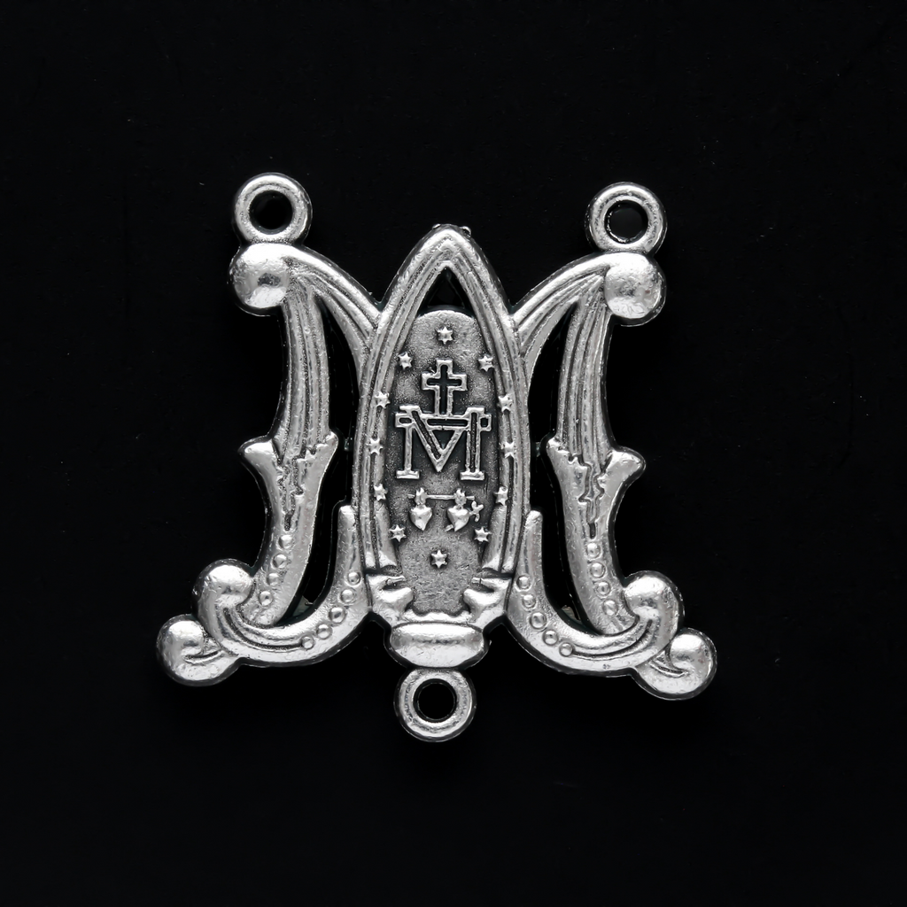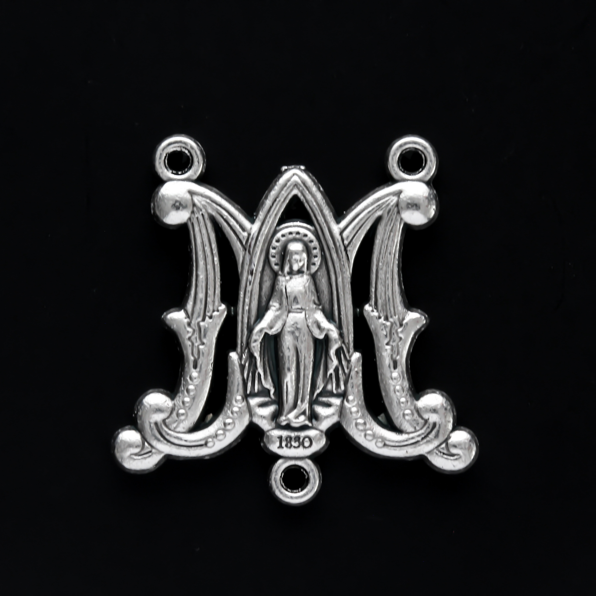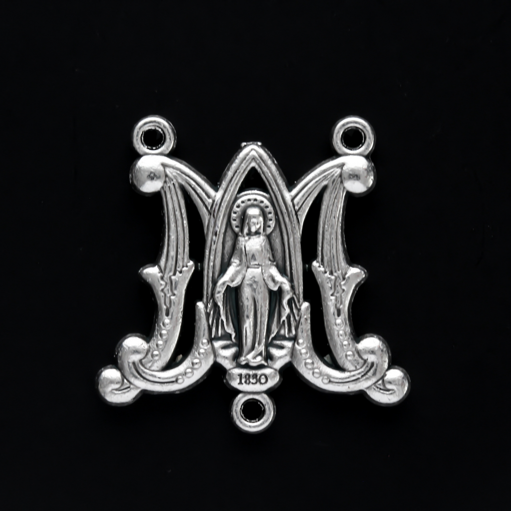 SKU: RCP01bA beautiful, large rosary centerpiece in the shape of an intertwined A and M for "Ave Maria" with a Miraculous Medal in the center. Gorgeous detail to this piece would be a lovely addition to your next rosary. This detailed die-cast centerpiece is made in the region of Italy that produces the finest quality medals in the world.