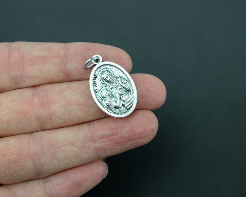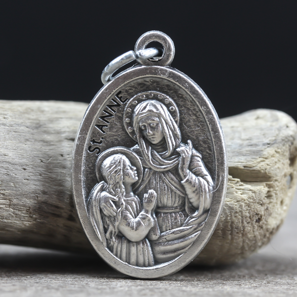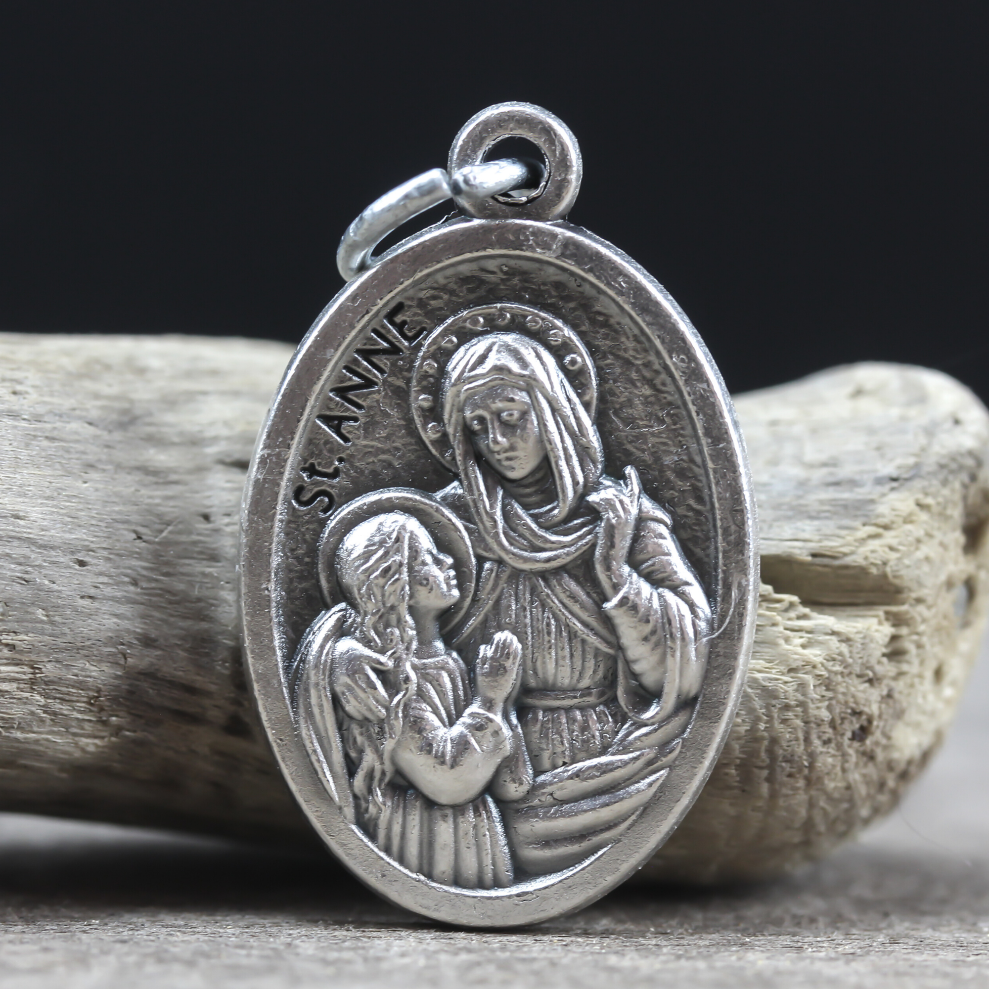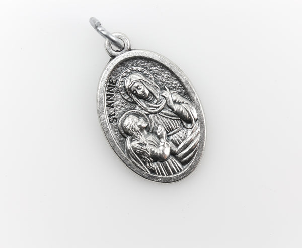 SKU: CM249Saint Anne medal. Anne is the mother of Mary and the grandmother of Jesus. The front of this medal depicts St. Anne with Mary as a child and the reverse is marked "Pray For Us'. This detailed die-cast medal is made in the region of Italy that produces the finest quality medals in the world.