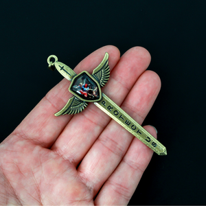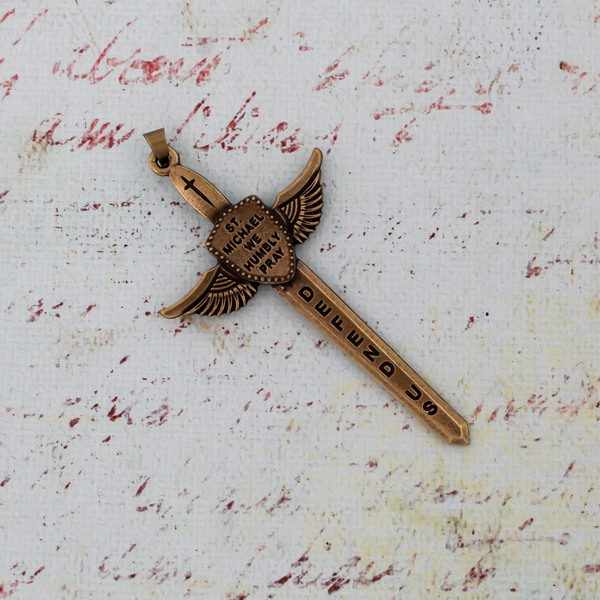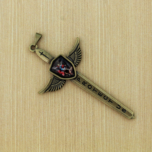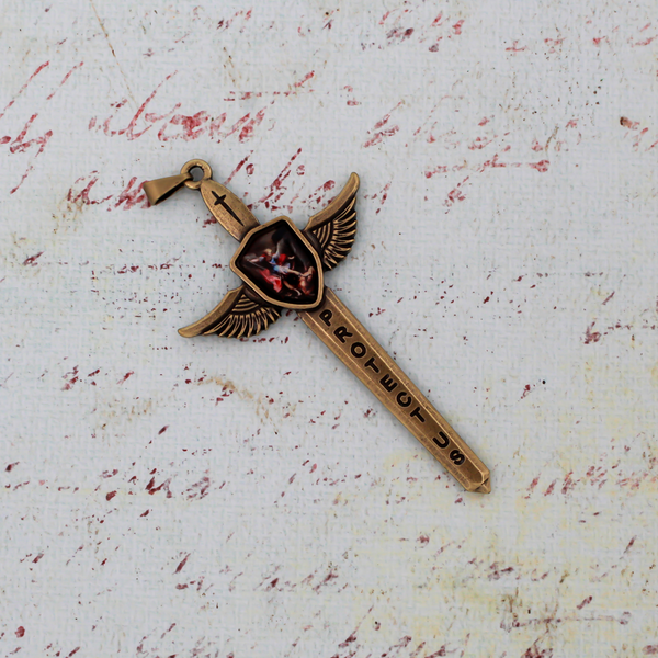 Saint Michael's Sword pendant in an antiqued bronze finish. The front depicts an epoxy image of St. Michael between the wings. The blade is engraved with "Protect Us" on the front side and "Defend Us" on the backside. It is also engraved with "St. Michael we humbly pray" in the shield between the wings.