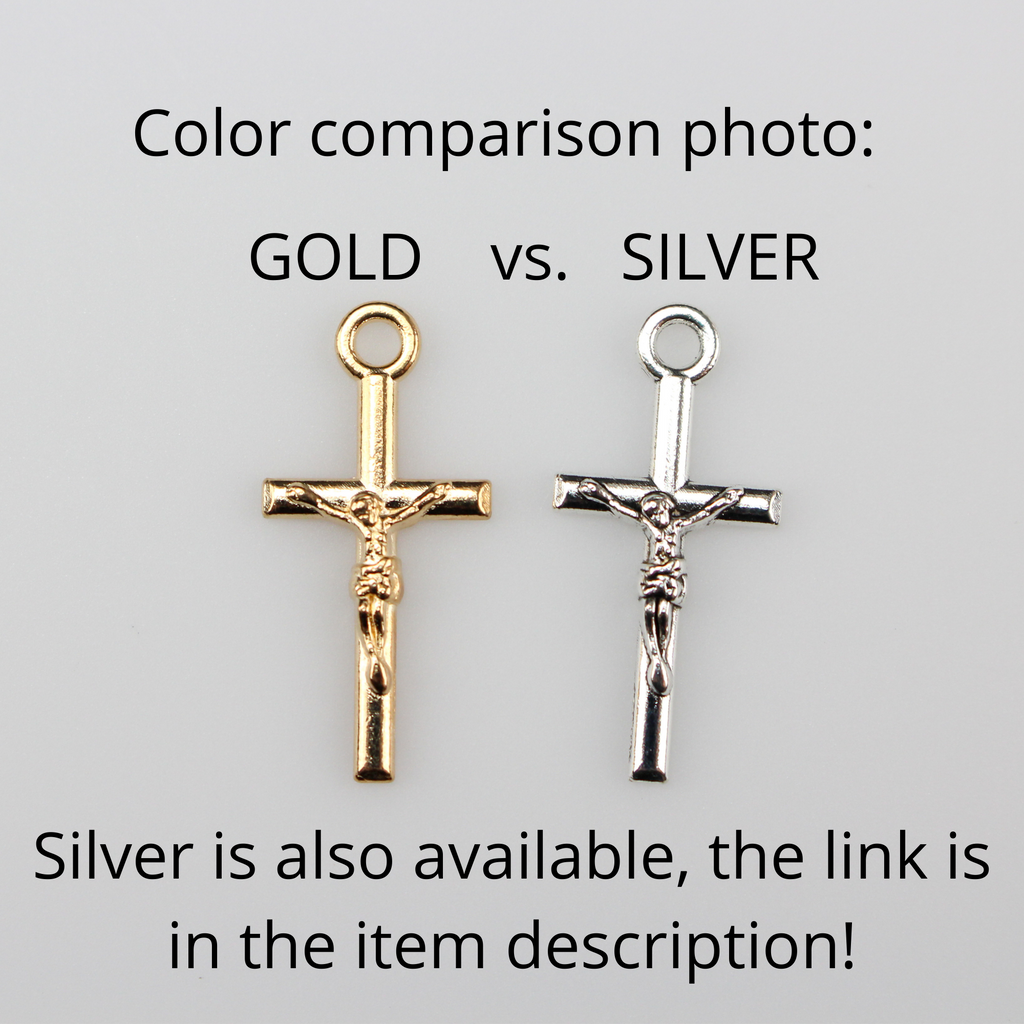 Small crucifix crosses with a gold-tone finish. The small size makes them perfect for dainty necklaces, charm bracelets, or small rosary chaplets.