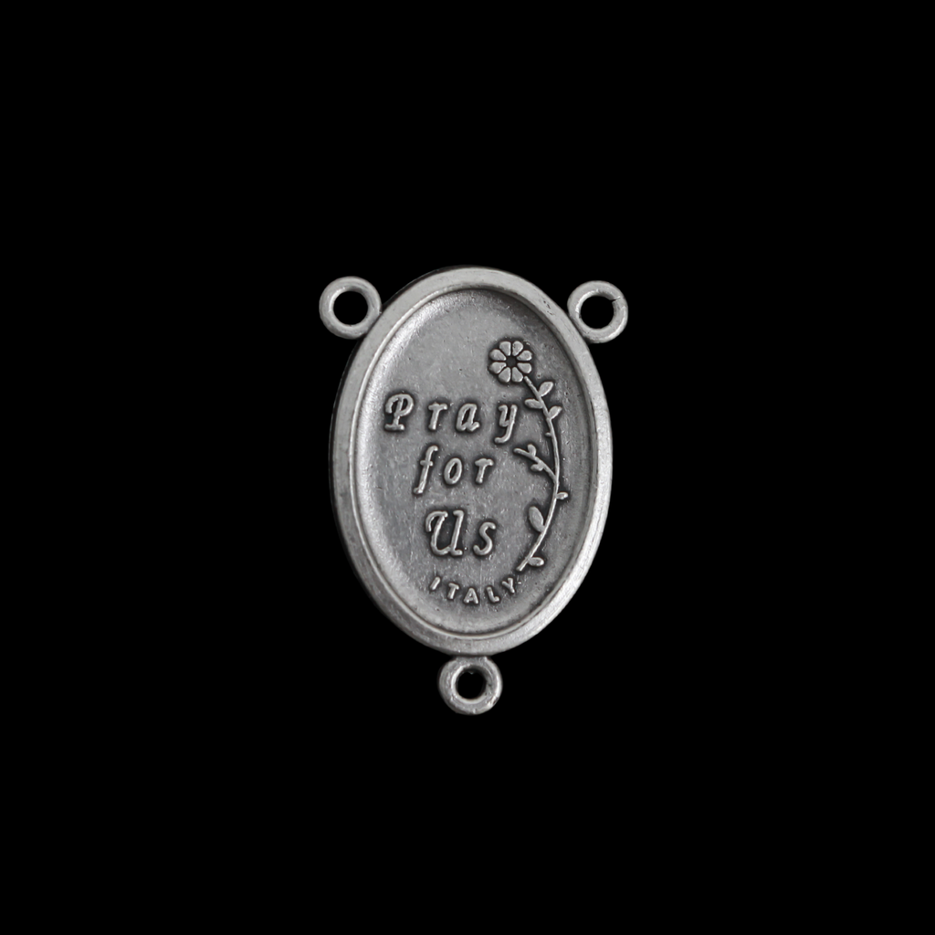 Our Lady of Fatima oval rosary centerpiece that is marked "Pray For Us" on the back. This silver oxidized rosary centerpiece has gorgeous details and would be a lovely addition to your next rosary. It is imported from Italy and ready to be used in your next jewelry design.