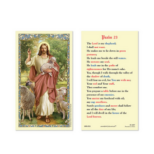 SKU: BX05DThis laminated holy card features a beautiful Catholic image of Jesus the Good Shepherd on the front with a distinctive gold foil stamping design around the edge. It includes "Psalm 23" on the back.
