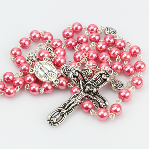 Our Lady of Fatima Rosary with 6mm Pink Glass Beads and Relic Center - 18" long