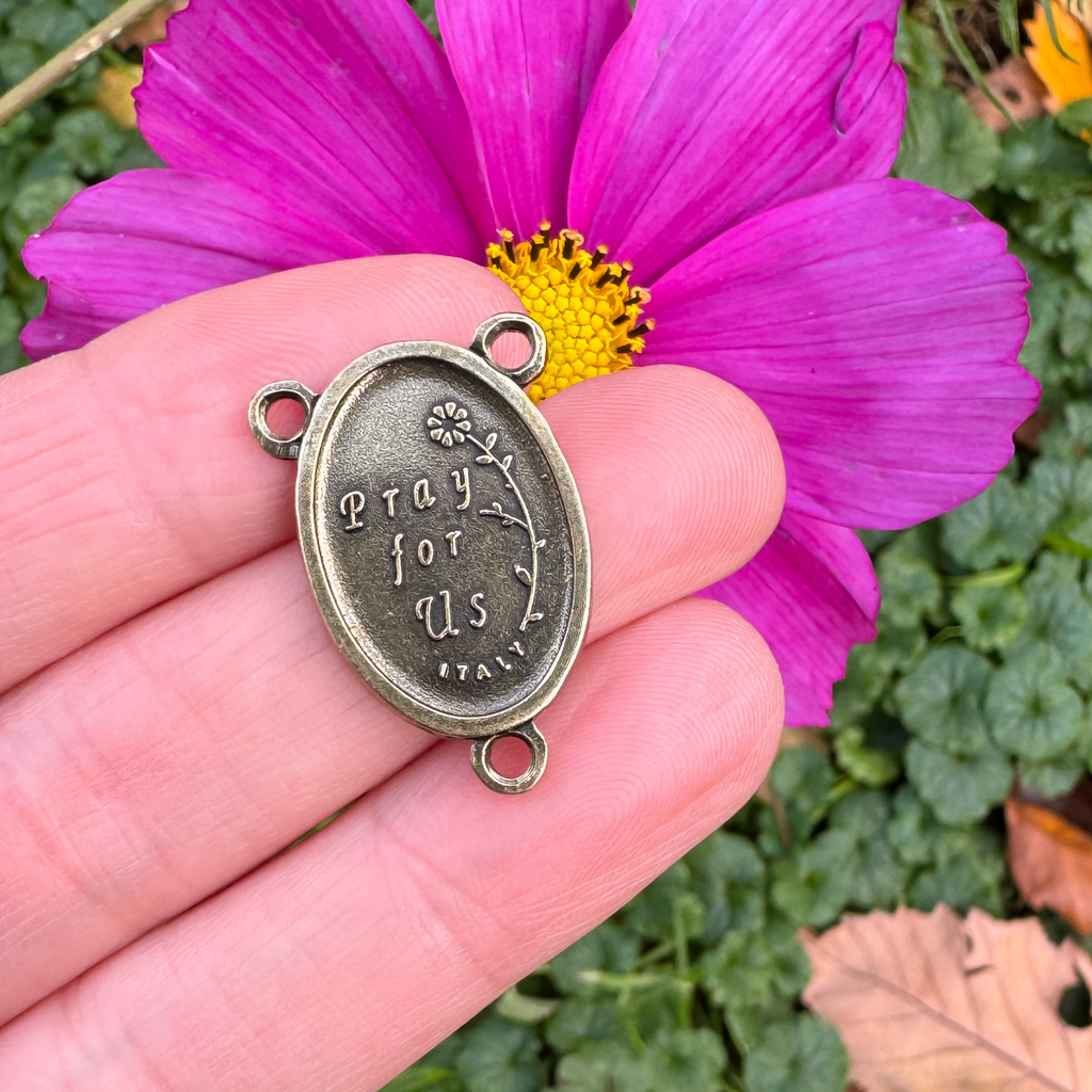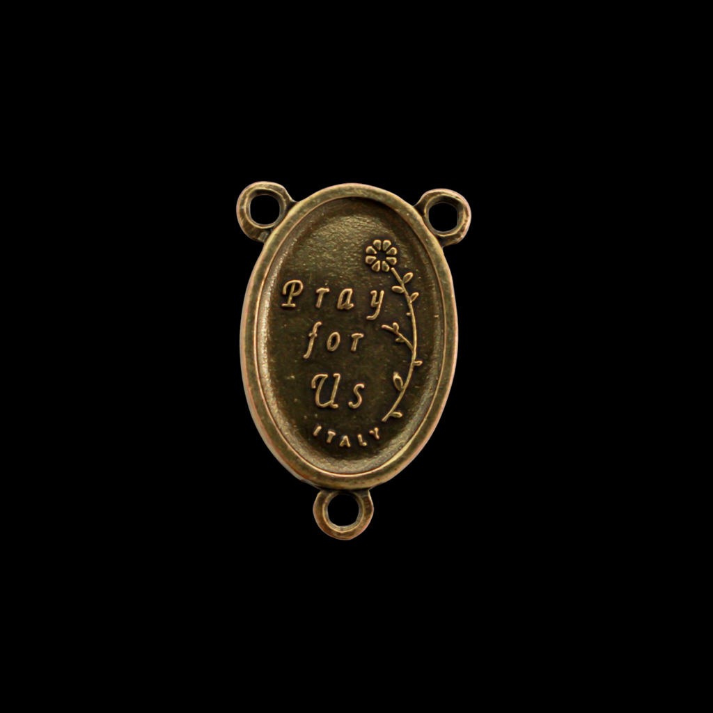 Bronze one inch oval rosary centerpiece that features Our Lady of Guadalupe on the front and "Pray For Us" on the back. This silver oxidized rosary centerpiece has gorgeous details and would be a lovely addition to your next rosary. Handcrafted in Italy.