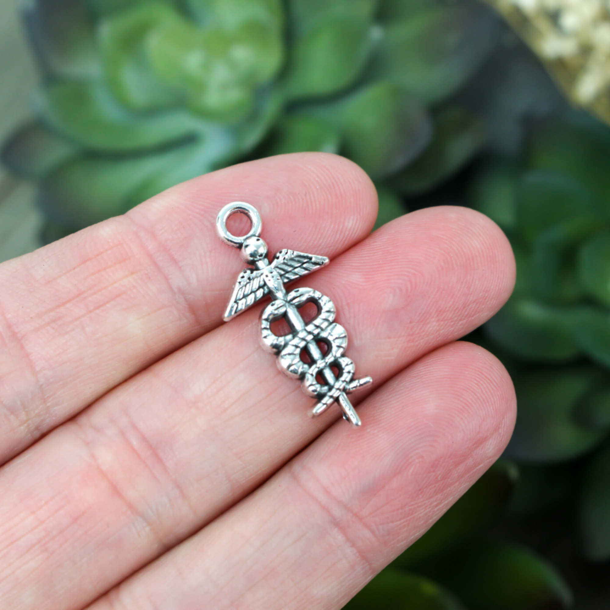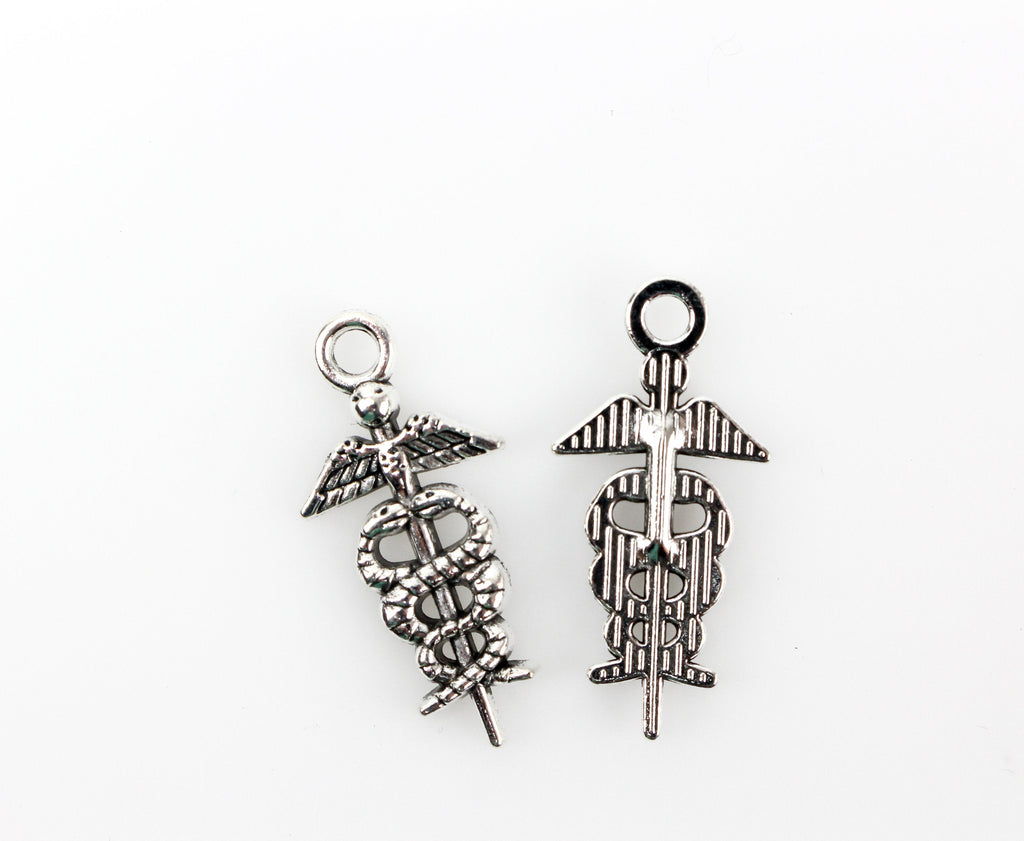 Silver-tone medical symbol caduceus charms. These charms would pair perfectly with our Saint Agatha medal who is the patron saint of nurses.