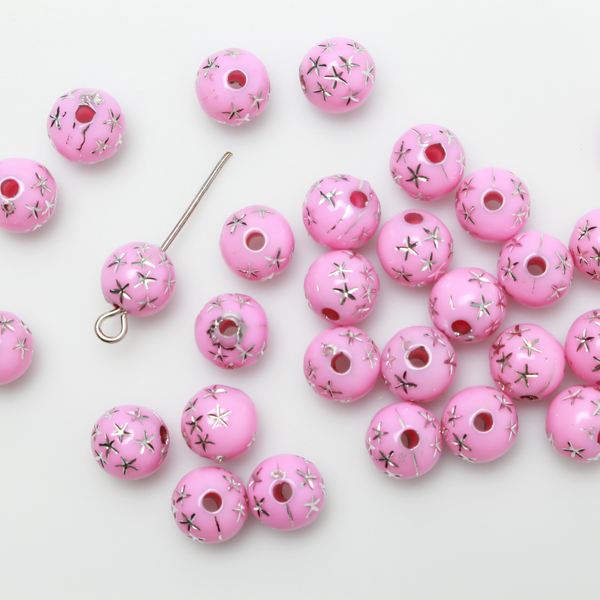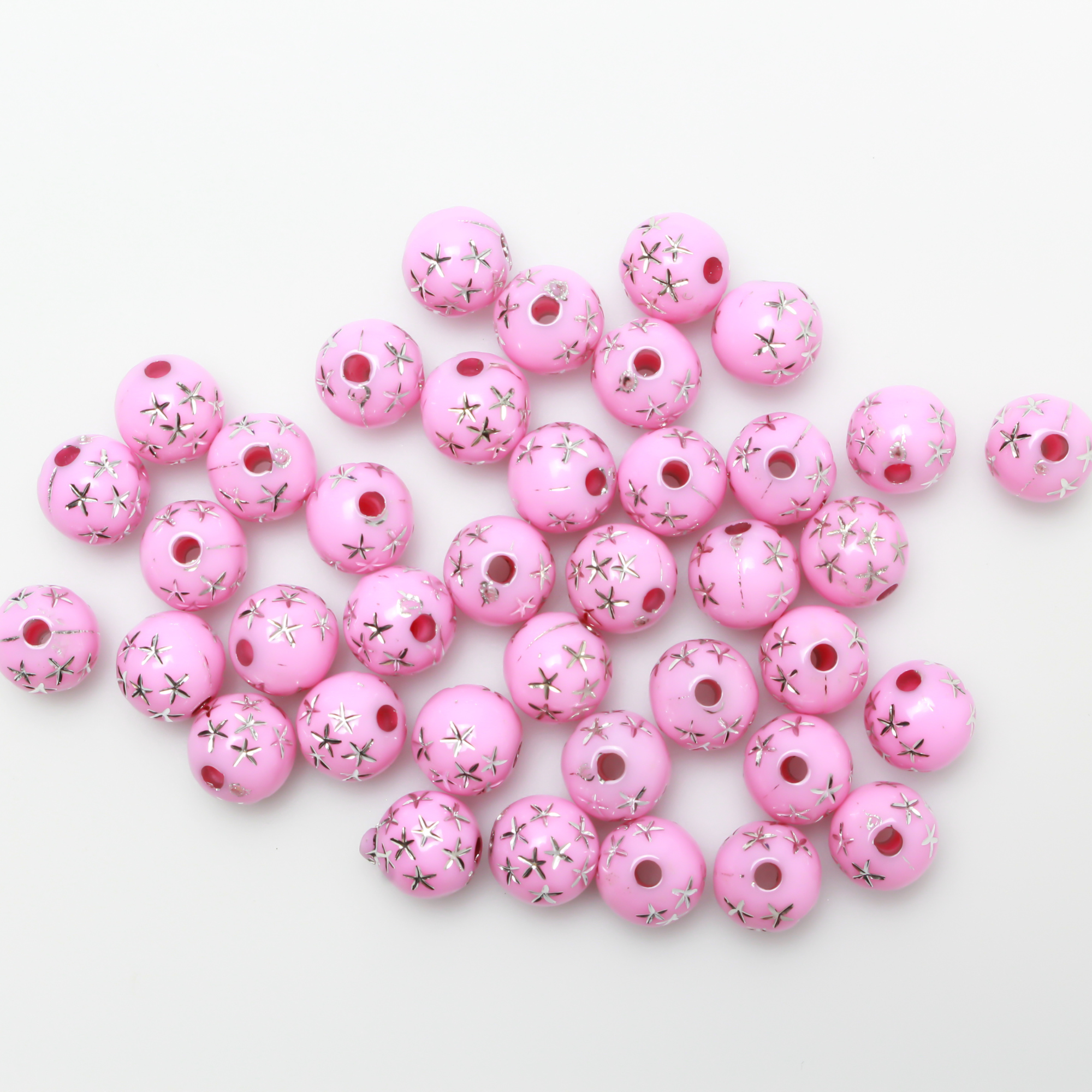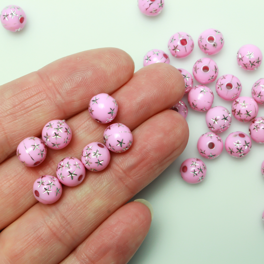 SKU: BD368mm Round pink opaque beads that have a silver star design etched into them.
