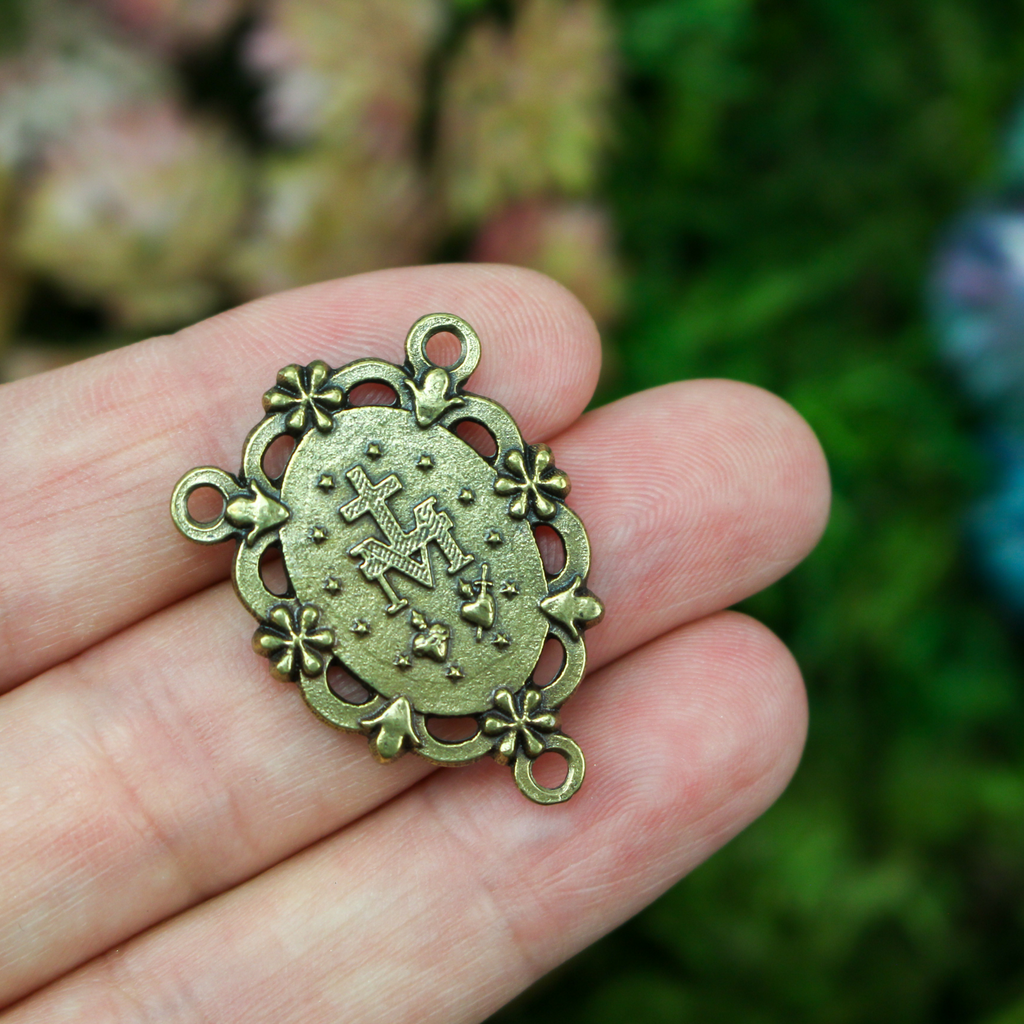SKU: RCP06Miraculous Mary rosary centerpiece. This bronze-tone rosary centerpiece has gorgeous details with filigree cut out design and floral detailing. Would be a lovely addition to your next rosary. It is imported from Italy and ready to be used in your next jewelry design. next jewelry design.