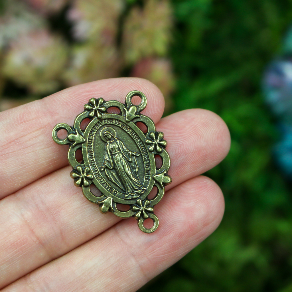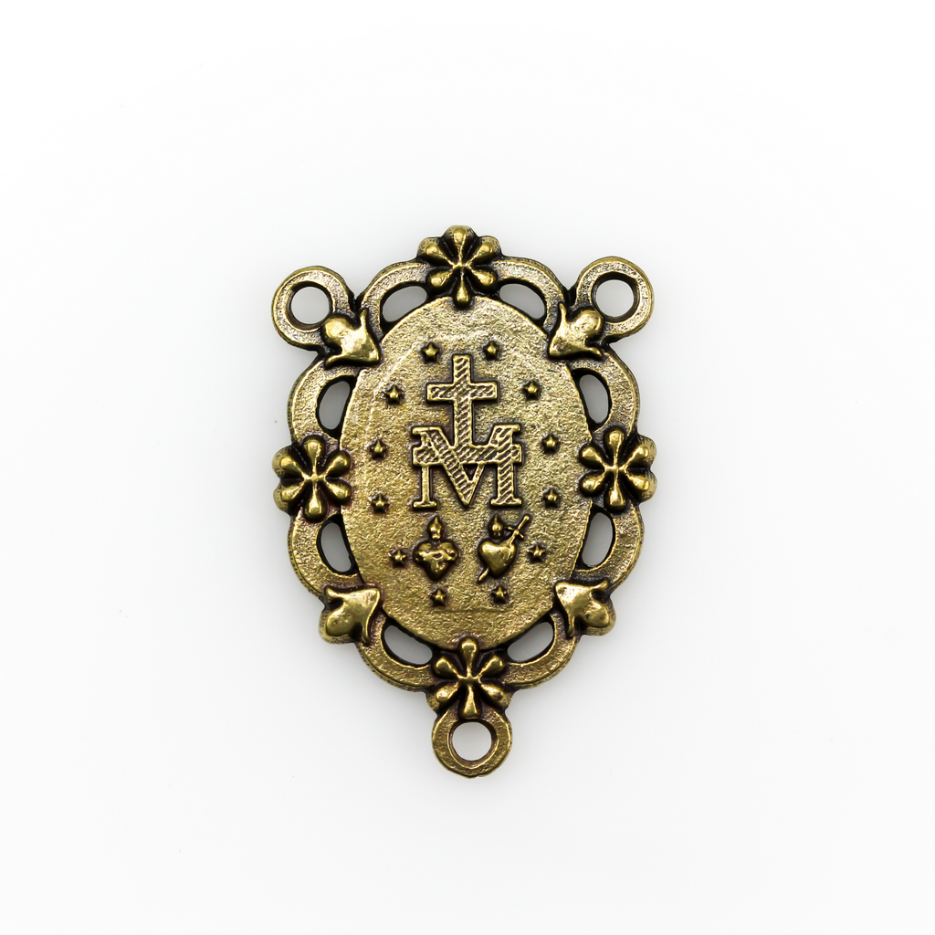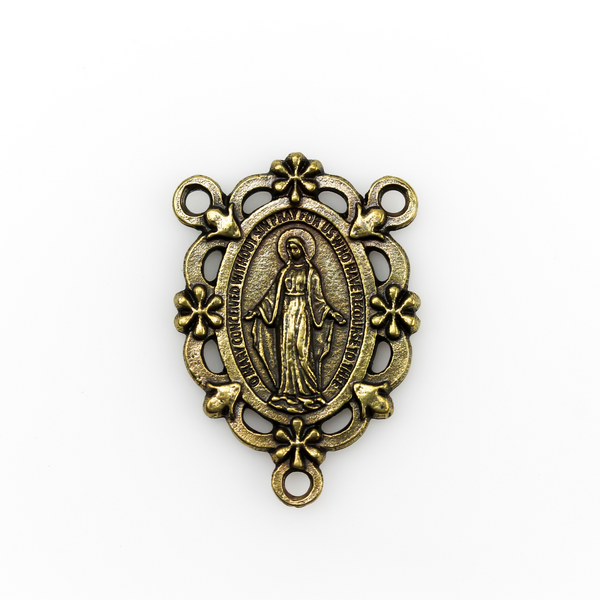 Bronze Virgin Mary Miraculous Medal Rosary Centerpiece with Filigree Flower Design