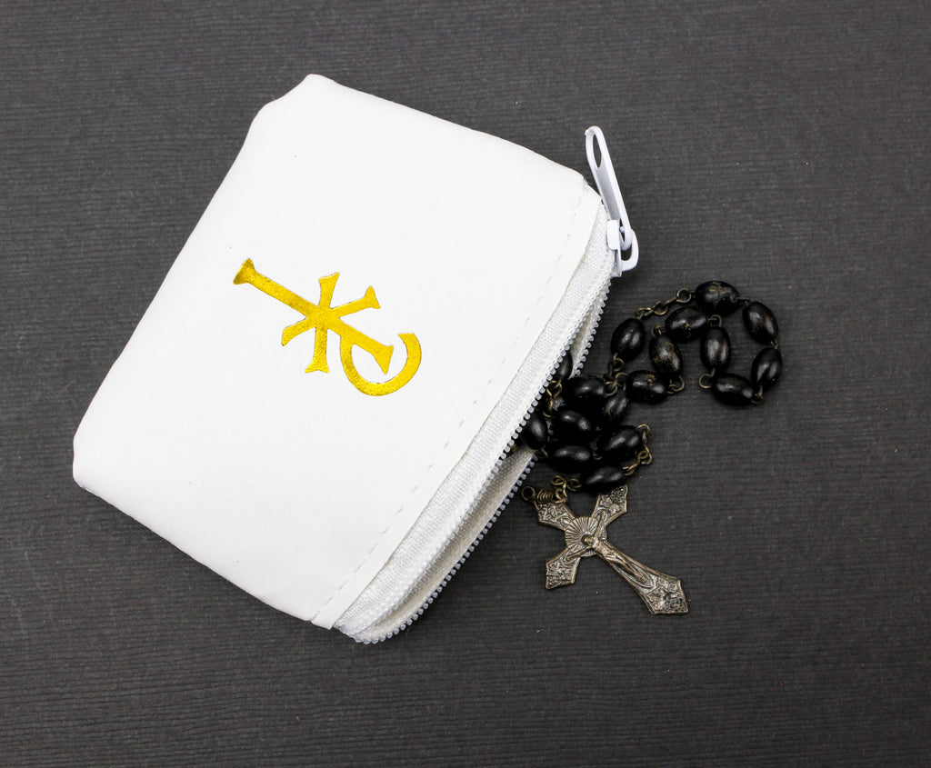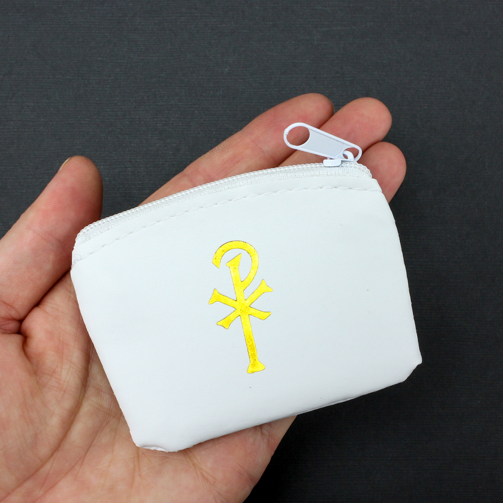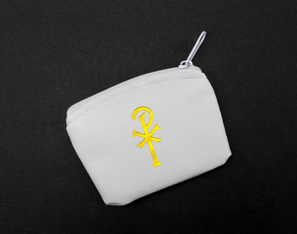 Chi Rho White Vinyl Rosary Pouch Coin Purse with Zipper Closure
