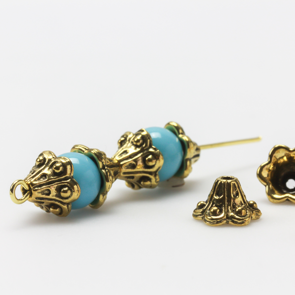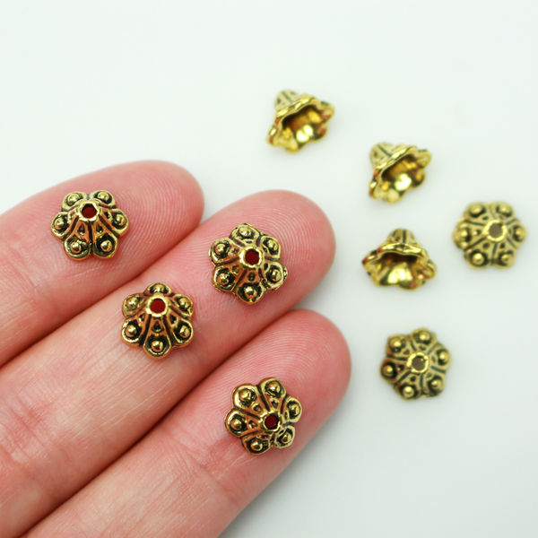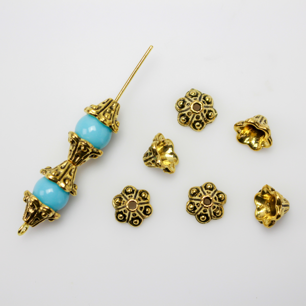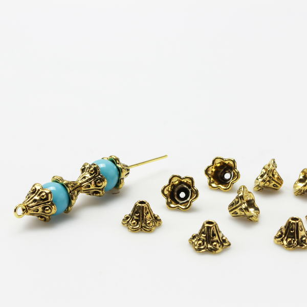 Bell flower shaped bead caps that will fit beads 8mm - 10mm. Shown on an 8mm glass bead for size reference. Sold in packages of 50 caps