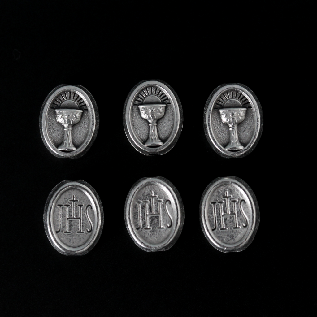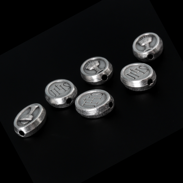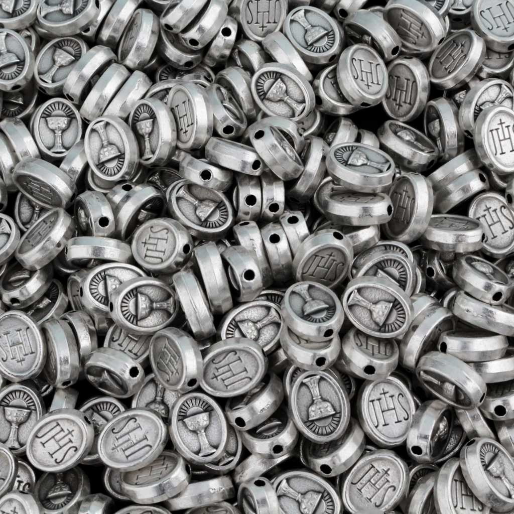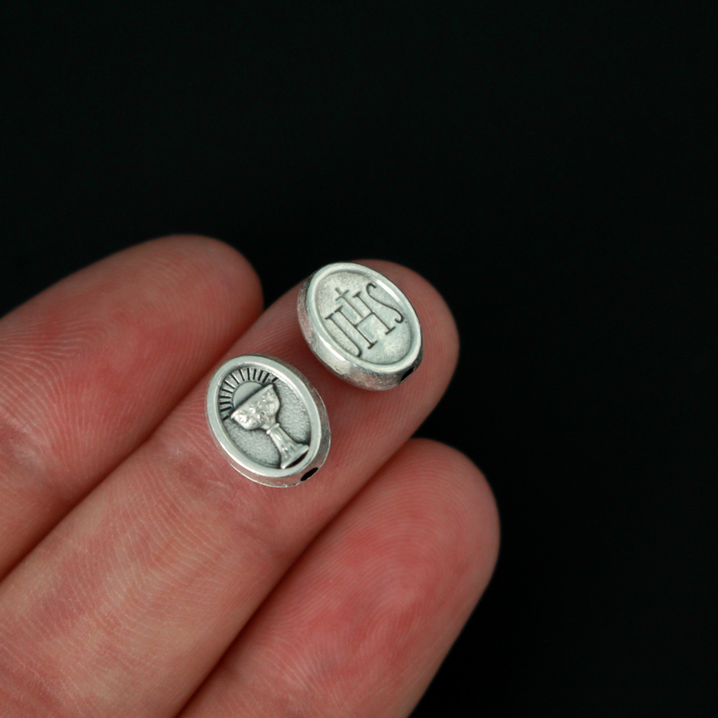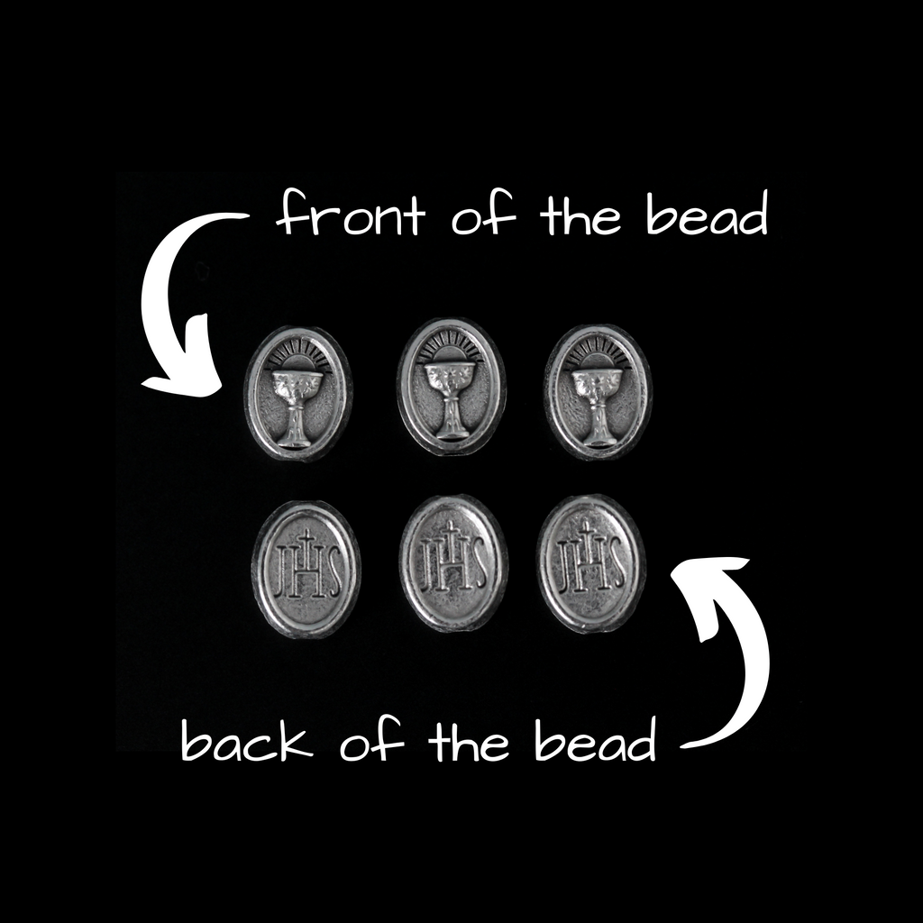 Holy Communion metal beads that depicts a chalice on the front and the Christogram "JHS" on the back