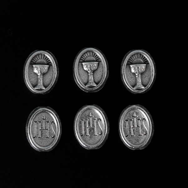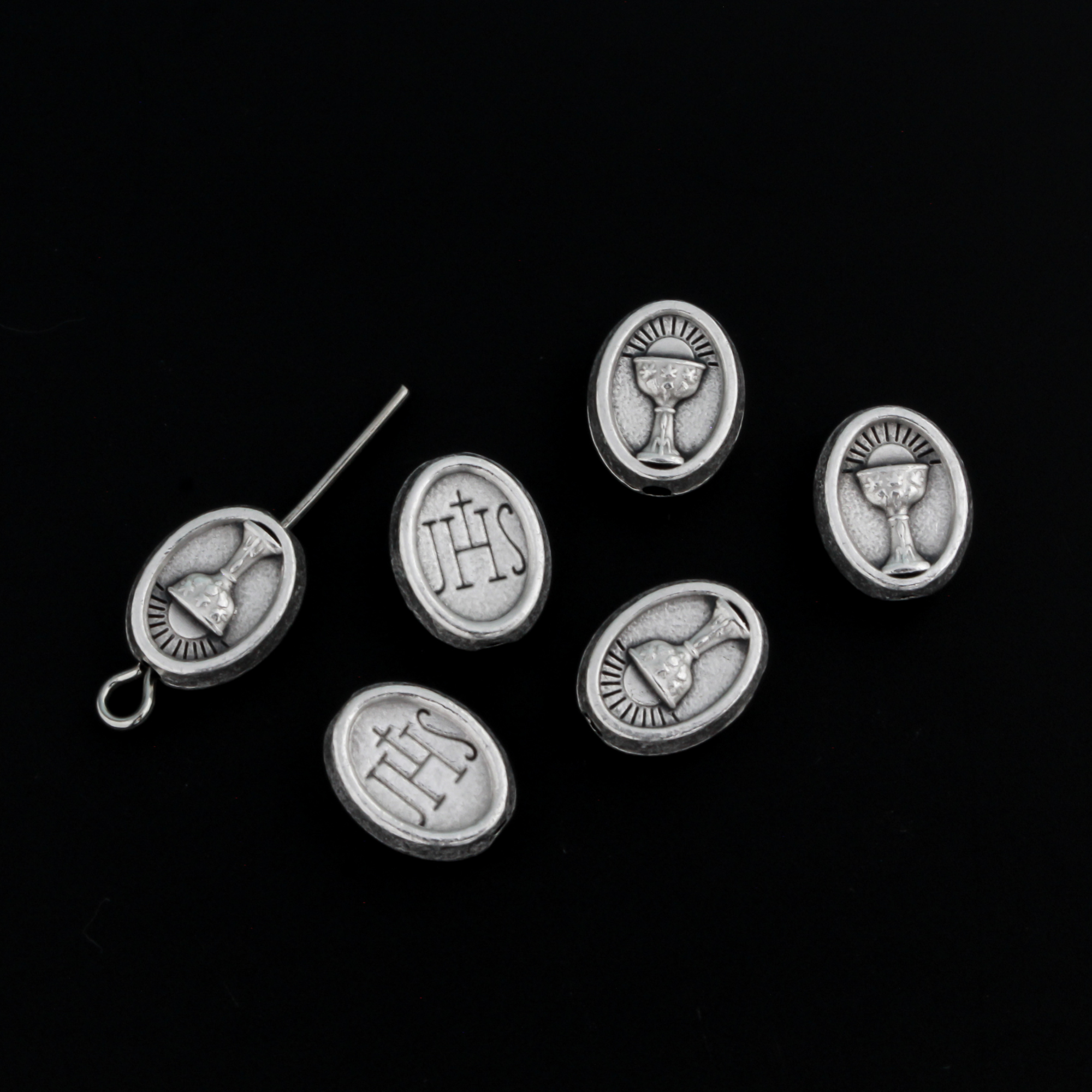 Holy Communion metal beads that depicts a chalice on the front and the Christogram "JHS" on the back. These oval beads are silver oxidized base metal and are made in Italy. They are perfect to use as accent beads, Our Father beads, or they can be used for a whole rosary or bracelet! Sold in sets of six.