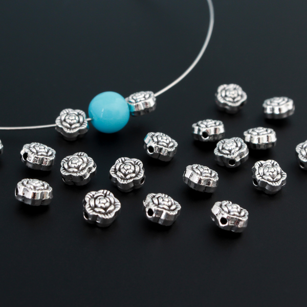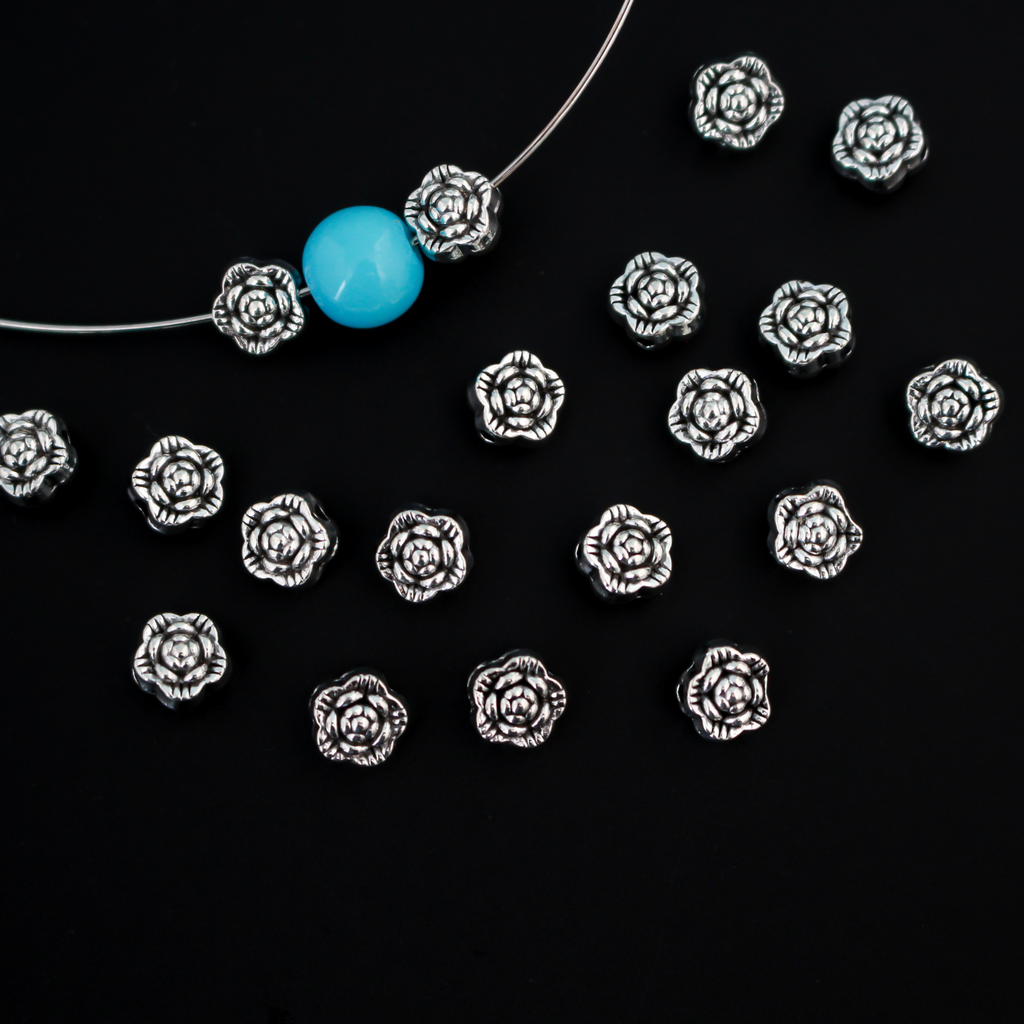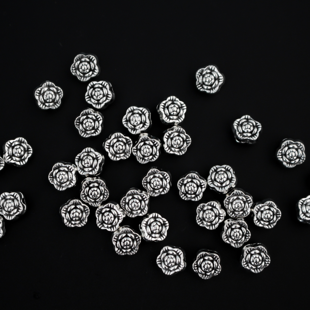 Antiqued silver-tone metal beads that are flat with a raised relief flower pattern on both sides. Perfect for rosaries, chaplets, bracelets, etc.