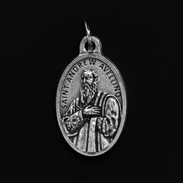 Saint Andrew Avellino medal that depicts the saint on the front and the reverse side is marked "Pray For Us"