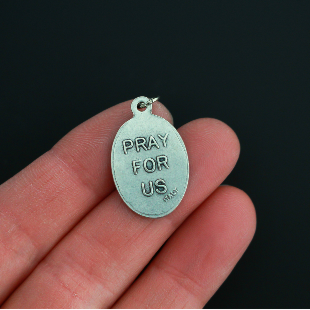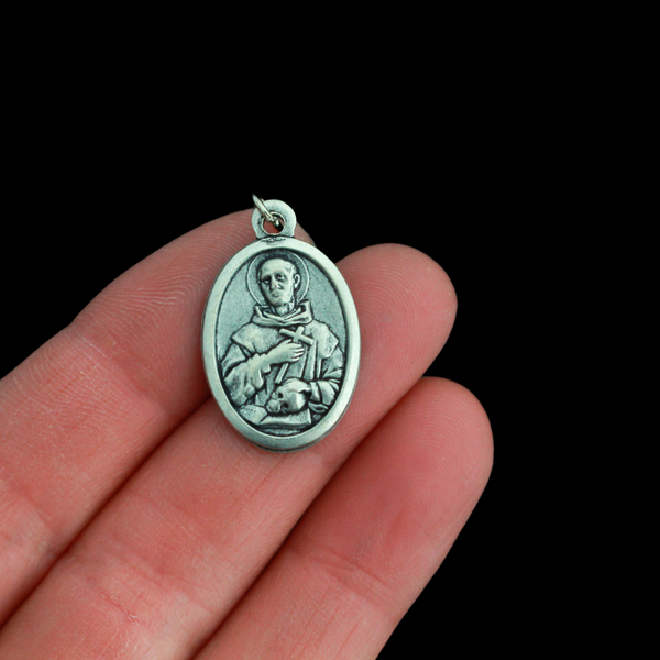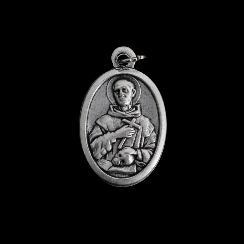 Saint Bruno of Cologne medal that depicts the saint with a skull on the front and is marked "Pray For Us" on the back.