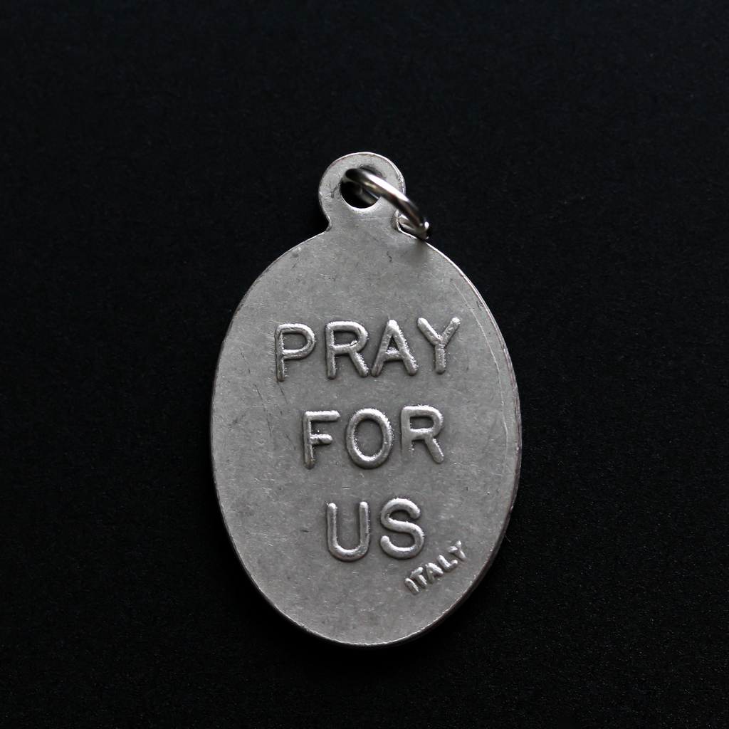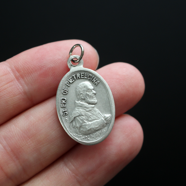 Saint Pio Padre oval medal that depicts the saint on the front and "Pray For Us