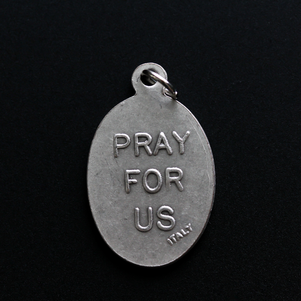 Saint Pio Padre oval medal that depicts the saint on the front and "Pray For Us" on the back. This detailed die-cast medal is made in the region of Italy that produces the finest quality medals in the world.