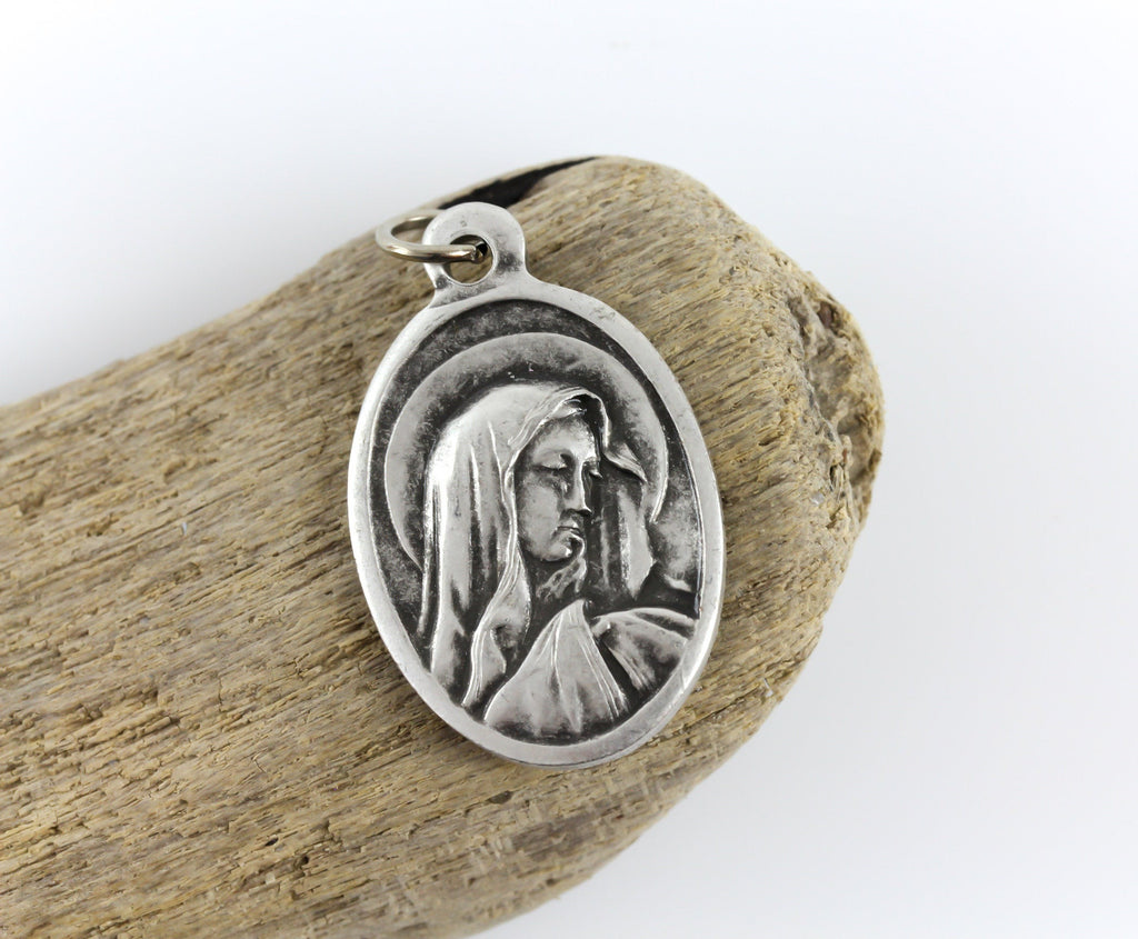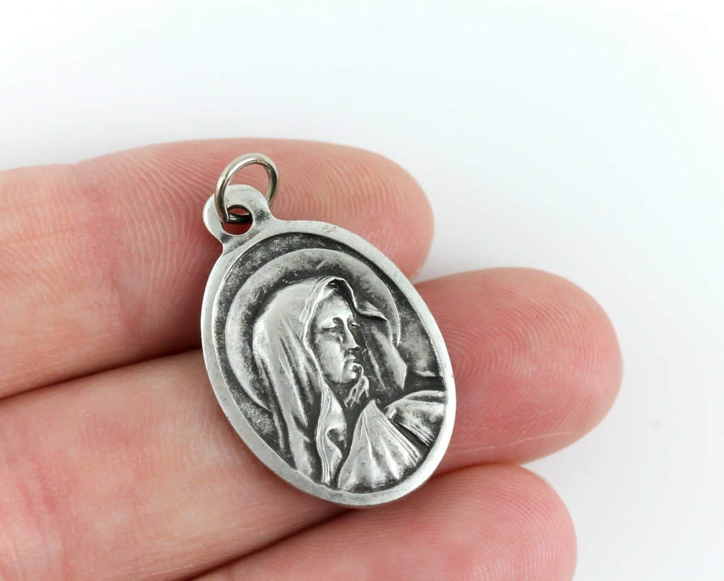Our Lady of Sorrows medal that depicts Mary on the front and is marked "Pray For Us" on the reverse. This detailed die-cast medal is made in the region of Italy that produces the finest quality medals in the world.