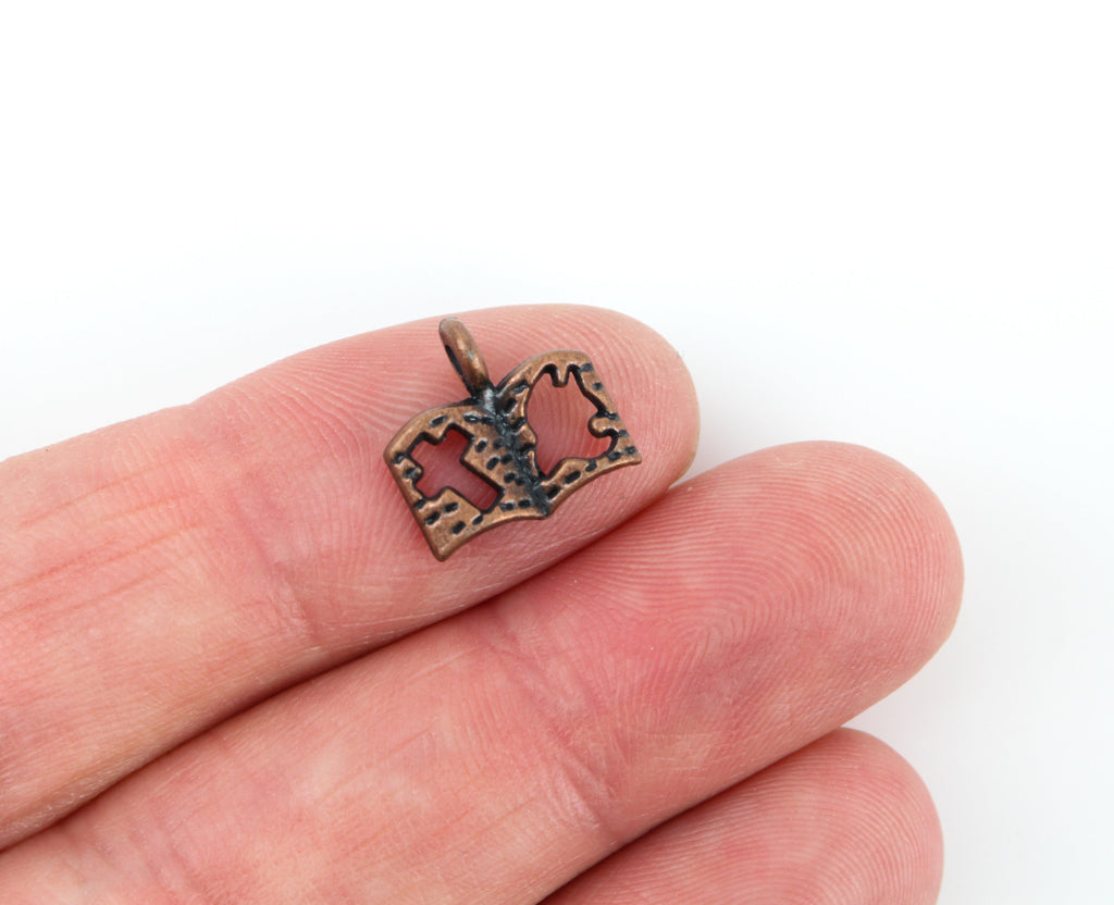 Tiny copper open bible charms with a cutout design of a cross on one side and a dove on the other. The tiny size makes them perfect for charm bracelets.
