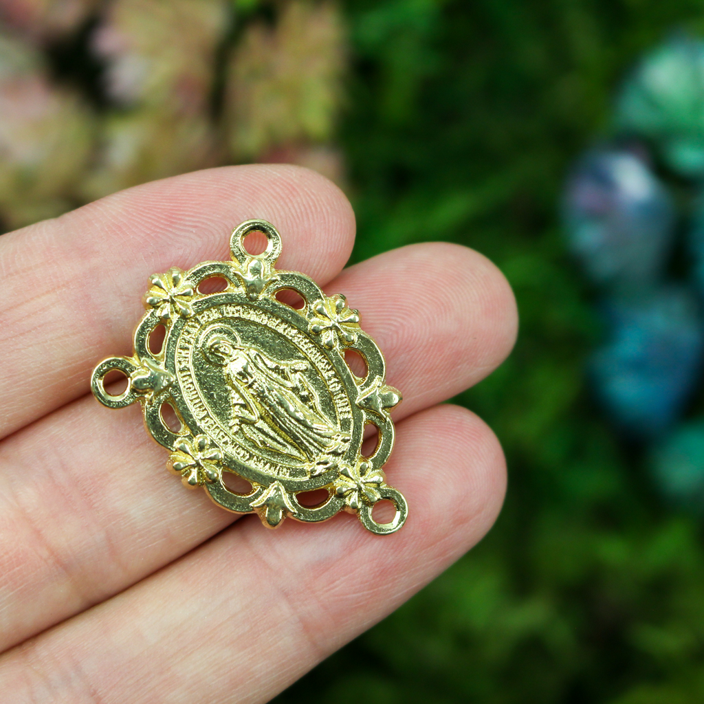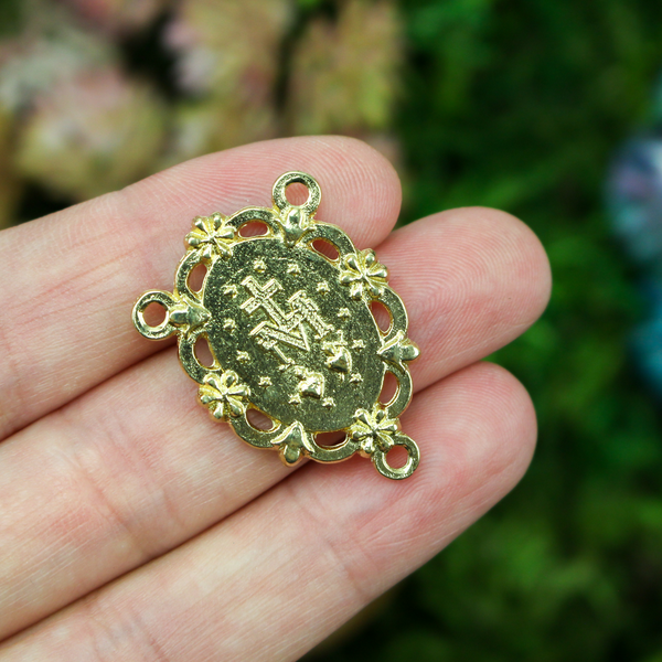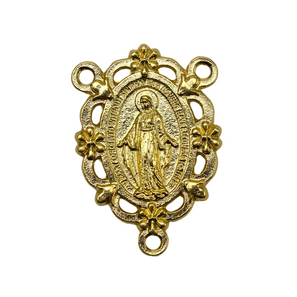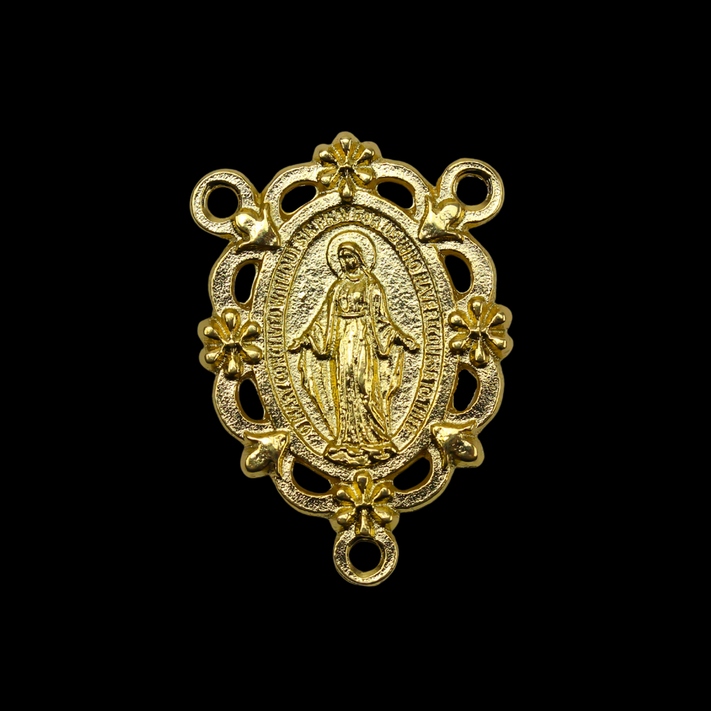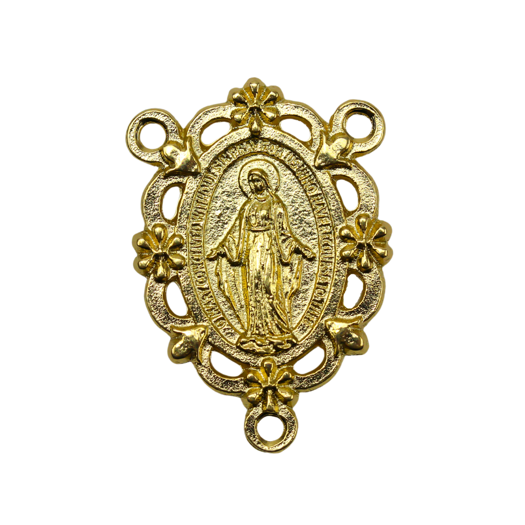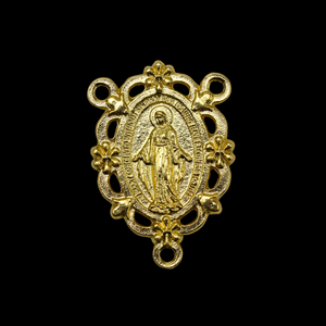 SKU: RCP28Miraculous Mary rosary centerpiece. This gold-tone rosary centerpiece has gorgeous details with filigree cut out design and floral detailing. Would be a lovely addition to your next rosary. It is imported from Italy and ready to be used in your next jewelry design. next jewelry design.