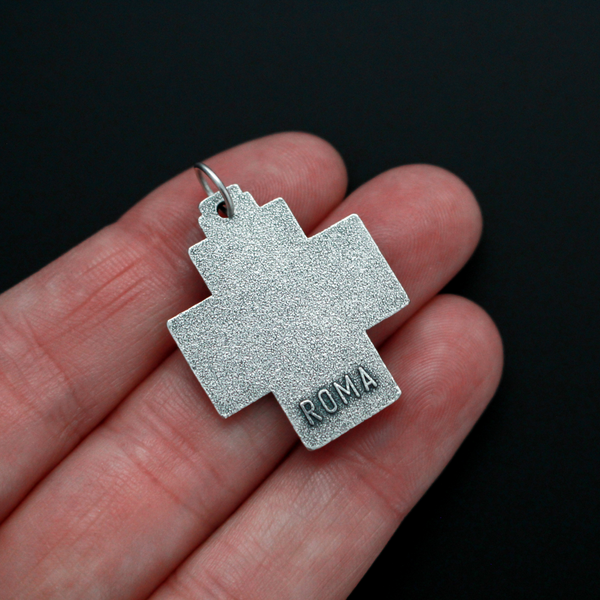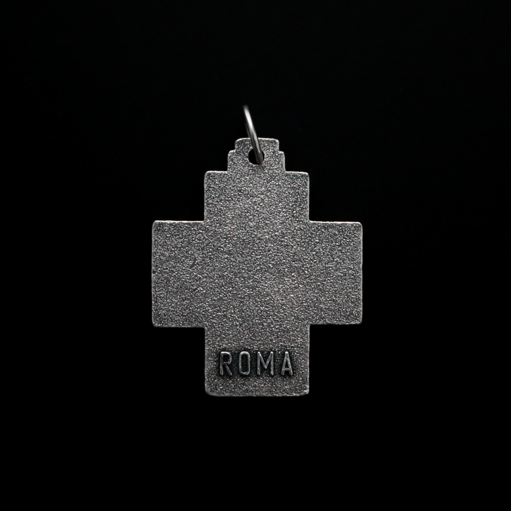 Alpha Omega Chi-rho cross made in Italy that features the symbols for alpha, omega, and Christ on the front. The reverse is marked "ROMA". Ready to be used in your next jewelry project.