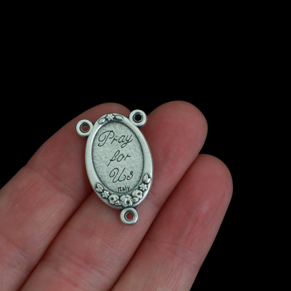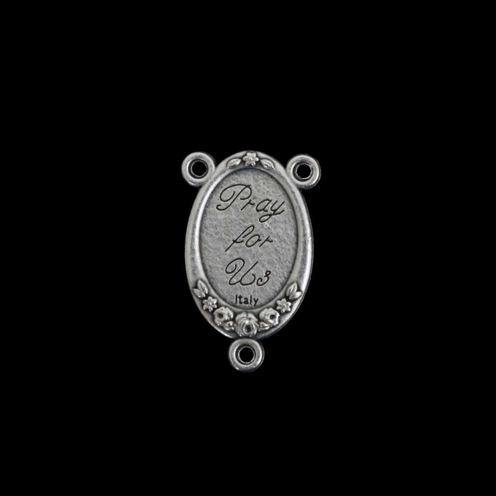 SKU: RCP05Rosary center that has a color image of Our Lady of Grace inlaid in a silver oxidized center with a flower detail on the edge. The reverse side is marked "Pray For Us". Handcrafted in Italy.