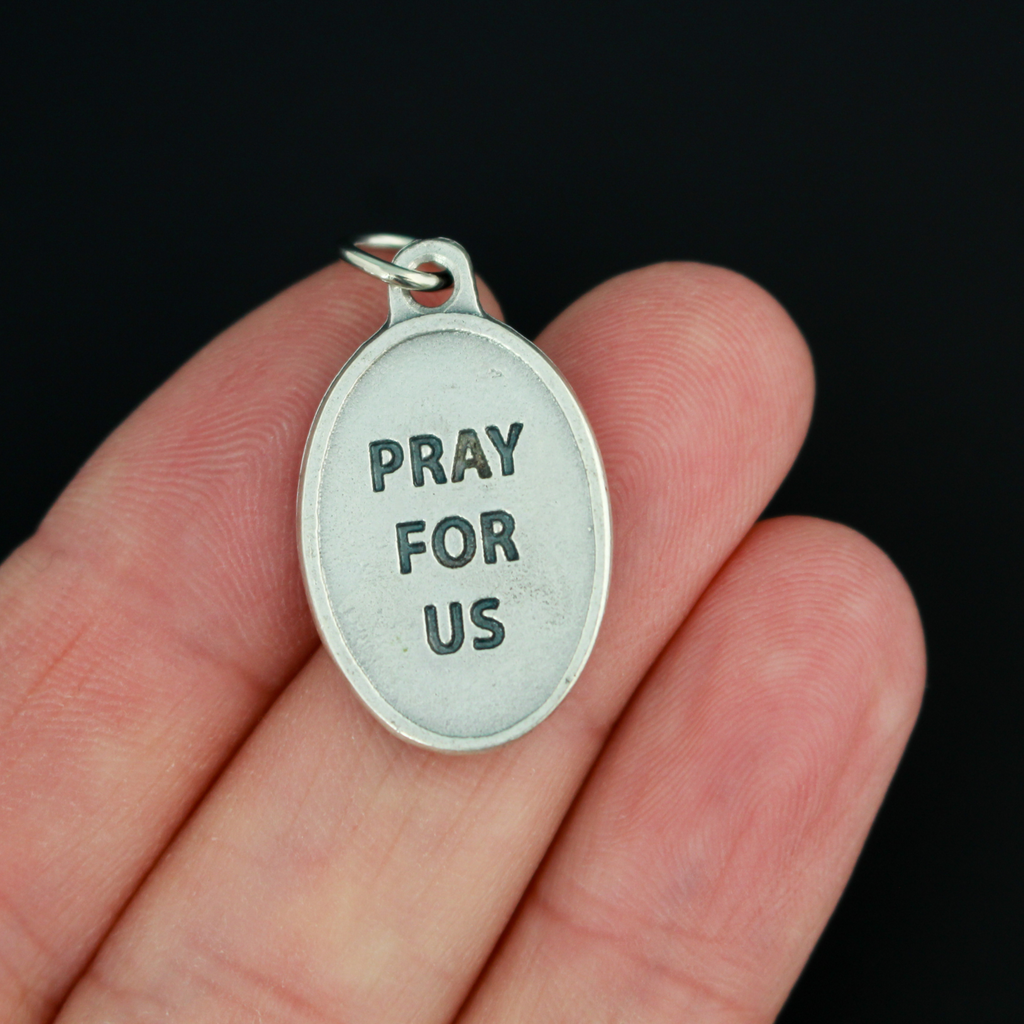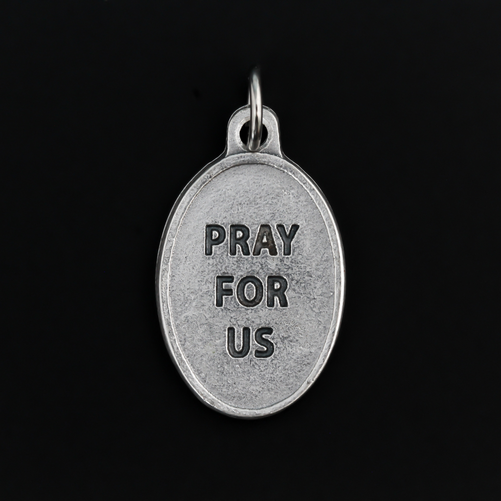 Virgin of the Valley medal that depicts Mary on the front and "Pray for us" on the back